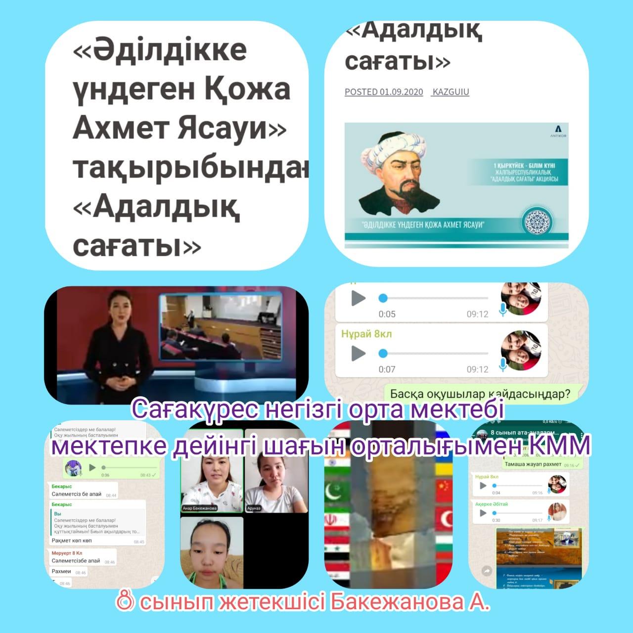 Ақсу ауданы, Сағакүрес негізгі орта мектебінде 2020 жылдың 02 қыркүйек күні өскелең ұрпақтың бойына сыбайлас жемқорлыққа қарсы мәдениетті қалыптастыру және адамгершілік құндылықтарды сіңіру мақсатында "Әділдікке үндеген Қожа Ахмет Яссауи" тақырыбында адалдық сағаттары өтті.