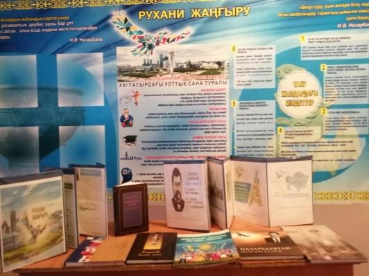 Алматы облысы, Ақсу ауданы, Сағакүрес негізгі орта мектебінде 2020 жылдың 5 - наурыз күні рухани жаңғыруды сипаттау және патриоттық сананы ынталандыратын ұлттық құндылықтарды жаңғырту мақсатында «Рухани жағынан бай шәкірт тәрбиелеуге үлес қосу- кітапхананың келелі міндеттерінің бірі» тақырыбында кітап көрмесін ұйымдастырылды