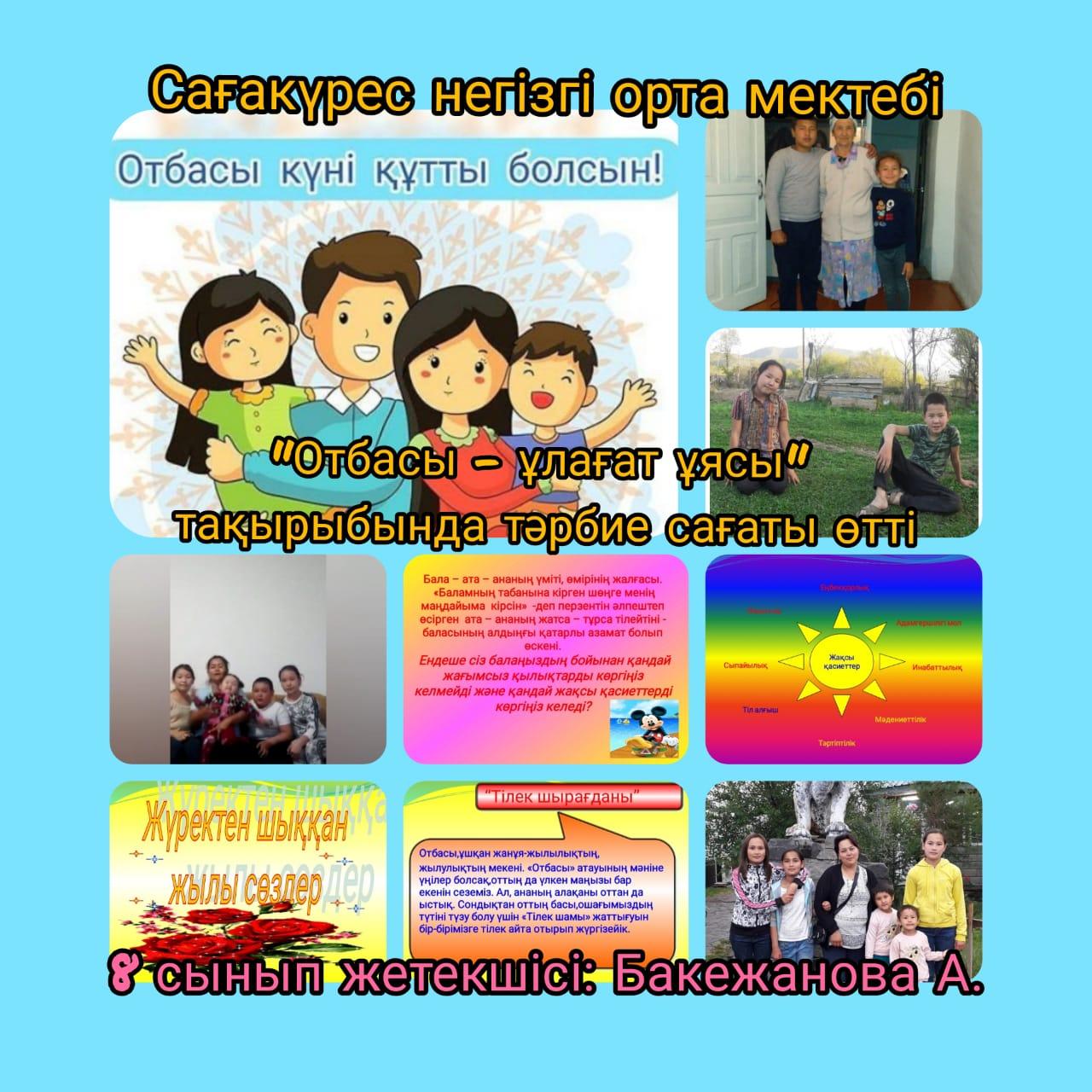 Ақсу ауданы, Сағакүрес негізгі орта мектебінде қыркүйектің 7-сі күні 8 сынып жетекшісі А.Қ. Бакежанова оқушыларға отбасы, ұшқан жанұя-жылылықтың, жылулықтың маңызы екендігін түсіндіре отырып "Отбасы- ұлағат ұясы" тақырыбында сағатын откізді.