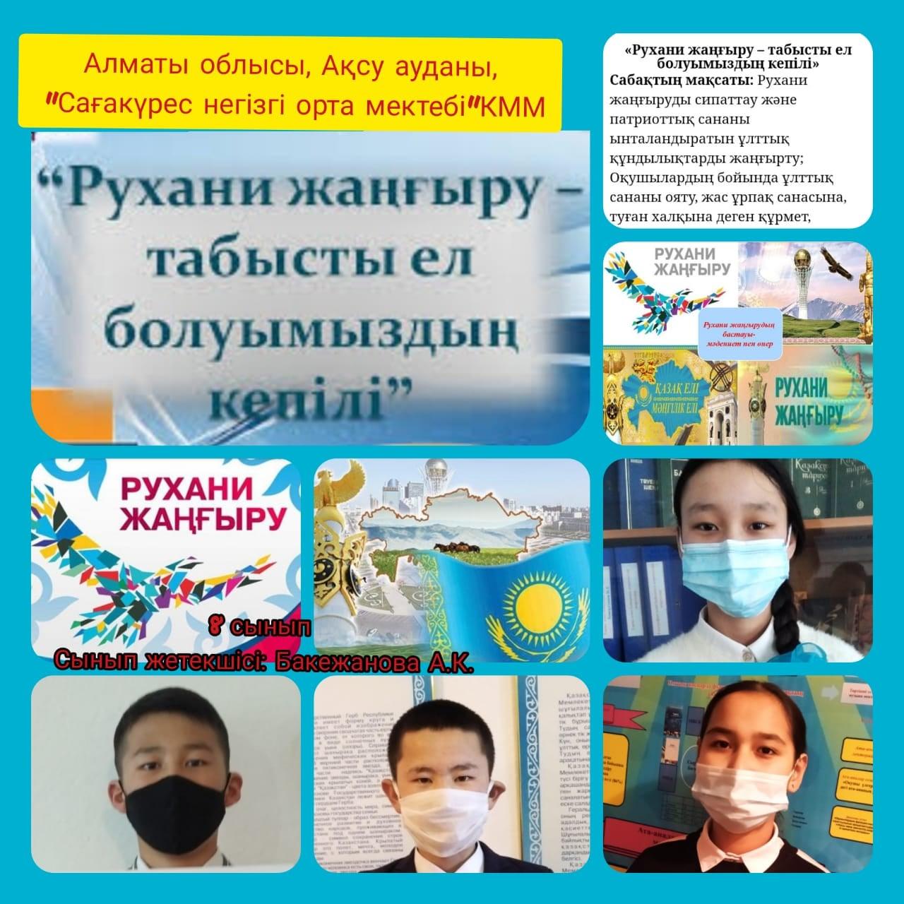 Ақсу ауданы, Сағакүрес негізгі орта мектебінде 2021 жылдың 12 ақпан күні 8 сынып жетекшісі А.К. Бакежанова "Рухани жаңғыру – табысты ел болуымыздың кепілі" тақырыбында сынып сағатын өткізді Мақсаты: Рухани жаңғыруды сипаттау және патриоттық сананы ынталандыратын ұлттық құндылықтарды жаңғырту: оқушылардың бойында ұлттық сананы ояту, жас ұрпақ санасына туған халқына деген құрмет, сүйіспеншілік, мақтаныш сезімін ұялату, ұлттық рухты сіңіру.