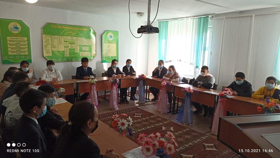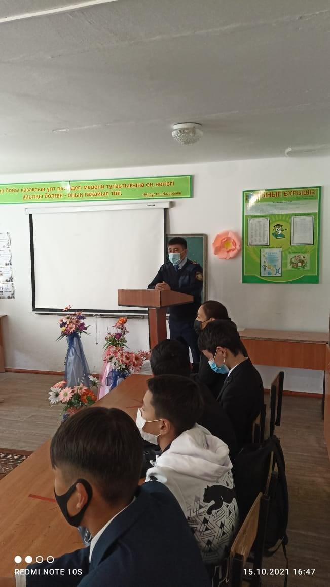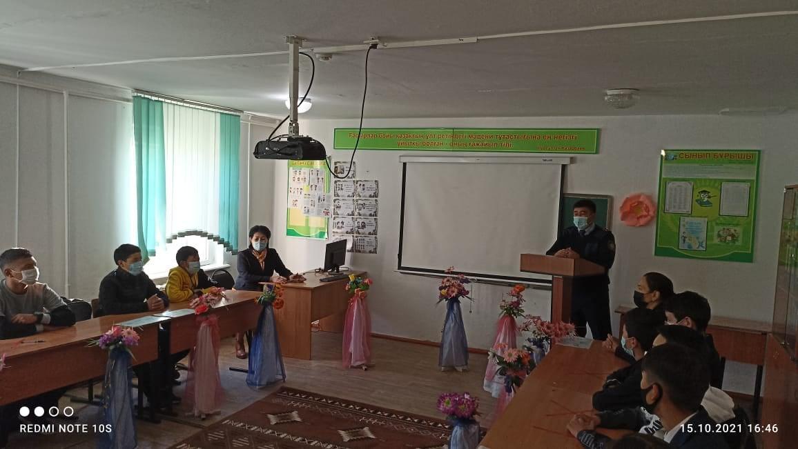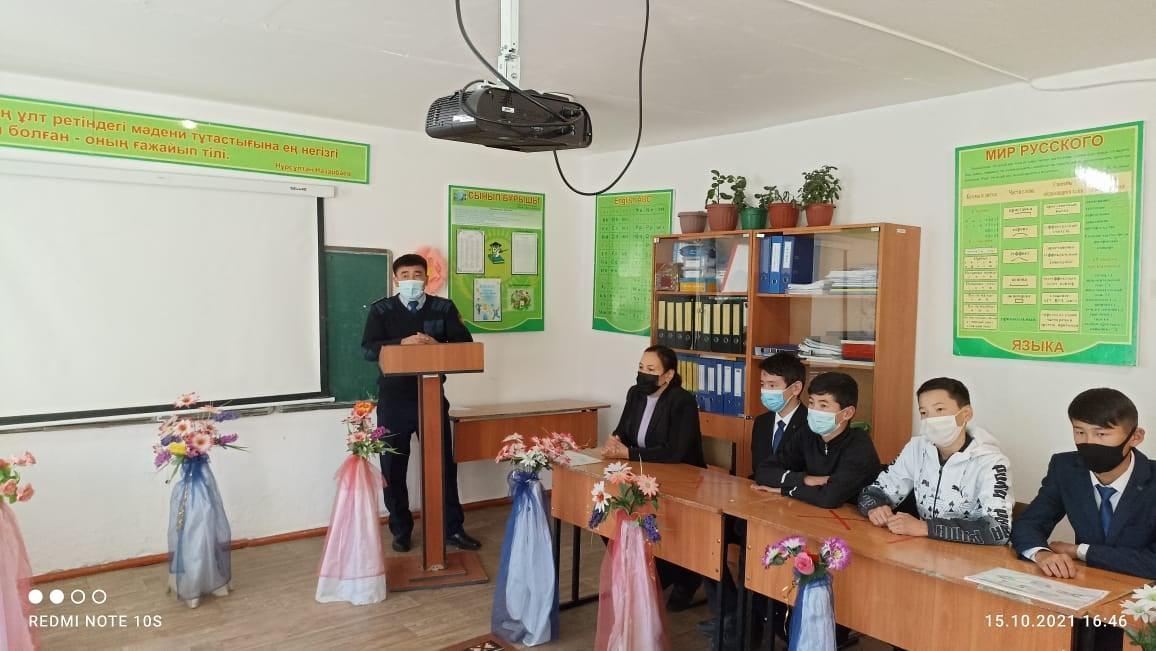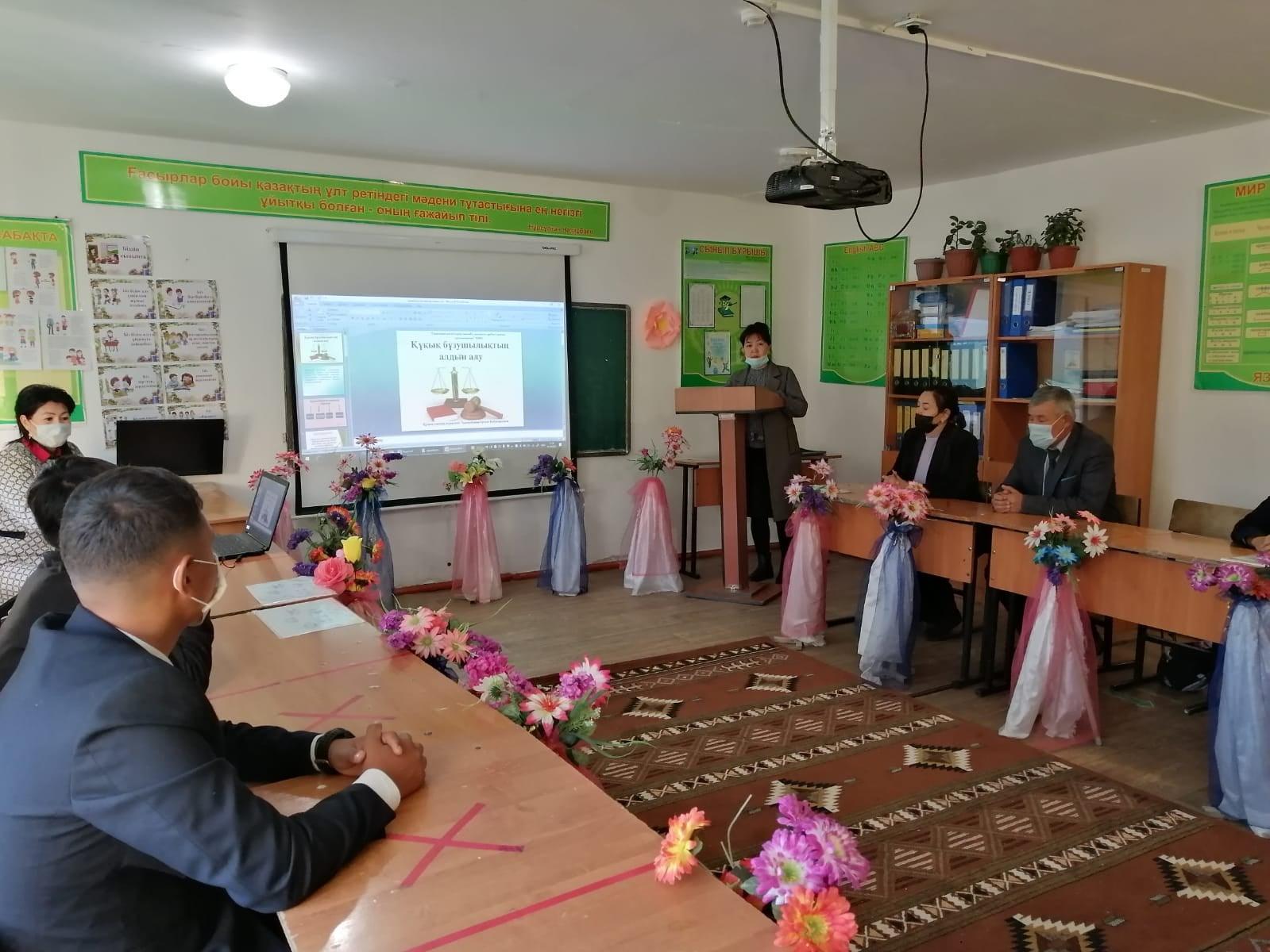14 қазан күні құқықтың он күндігіне орай оқу-тәрбие ісінің орынбасары Б.Е. Бимуханбетова "Құқық бұзушылықтың алдын алу" тақырыбында 7-9 сыныптар арасында ауылдық учаскелік инспектор Алдабергенов Медет Тоқтарбекұлымен кездесу ұйымдастырылды. Құқық пәнінің мұғалімі Г.И. Тымакбаева құқық бұзушылықтың алдын алуға байланысты баяндама оқып, бейнероликтермен таныстырды. Мақсаты: оқушылардың құқықтық сауаттылығын арттырып, құқық бұзушылық және қылмыс белгілерімен, түрлерімен таныстыру, жасөспірімдердің құқықтары мен міндеттерімен таныстыру. Қоғамның заңдарымен нормаларын орындауға, құқықтарын біліп оны құрметтеуге тәрбиелеу.