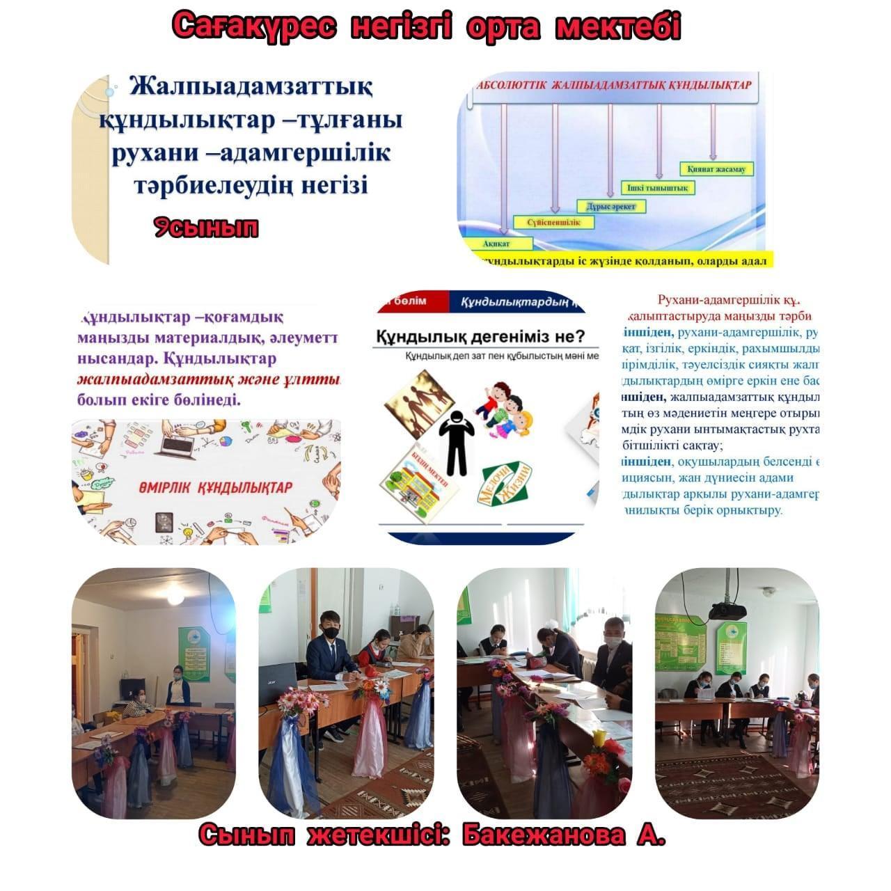 Алматы облысы Білім беру басқармасының Ақсу ауданы бойынша білім бөлімі» мемлекеттік мекемесінің «Сағакүрес негізгі орта мектебі, мектепке дейінгі шағын орталығымен» коммуналдық мемлекеттік мекемесінде 2021 жылдың 23 қараша жалпыадамзаттық құндылықтар күніне орай оқушыларға жалпыадамзаттық құндылықтар жайлы мағлұмат беру, өз бойымыздағы құндылықтарды іс жүзінде қолдану мақсатында 9 сыныпта "Жалпыадамзаттық құндылықтар-тұлғаны рухани - адамгершілік тәрбиелеудің негізі" тақырыбында сыныптан тыс шара ұйымдастырылды (сынып жетекшісі: А.К. Бакежанова