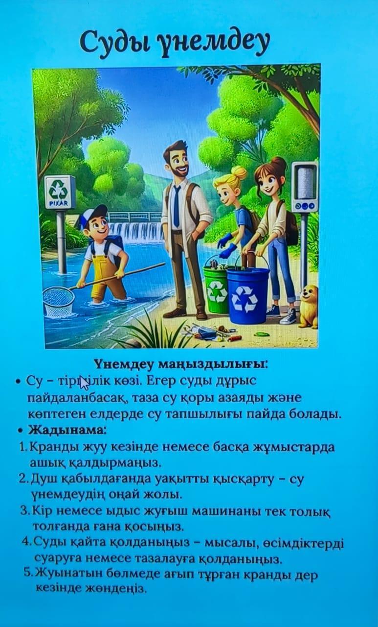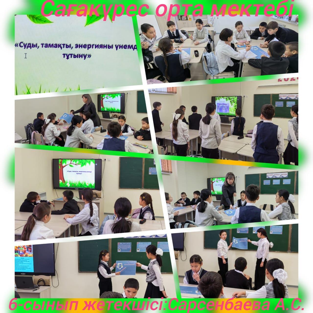 Жетісу облысы Ақсу ауданы бойынша білім бөлімі" мемлекеттік мекемесі "Сағакүрес орта мектебі" коммуналдық мемлекеттік мекемесі 2024 жылы 25 қараша күні 6- сынып жетекшісі: А.Сарсенбаева «Суды, тамақты, энергияны үнемді тұтыну» тақырыбында тәрбие сағатын өткізді.